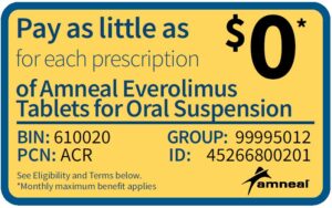To Patient: Commercially insured patients can use this copay card to reduce out-of-pocket expenses on eligible prescriptions filled with Amneal Everolimus Tablets for Oral Suspension. Mention this offer to your pharmacy along with a valid everolimus tablets for oral suspension prescription for an FDA-approved use. A monthly and yearly maximum savings benefit applies. By using this offer, you acknowledge that you meet the Eligibility Criteria and will comply with the Terms and Conditions set forth below.