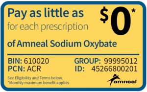 To Patient: Commercially insured patients can use this copay card to reduce out-of-pocket expenses on eligible prescriptions filled with Amneal Sodium Oxybate Sodium Oral Solution. Mention this offer to your pharmacy along with a valid sodium oxybate prescription for an FDA-approved use. A monthly and yearly maximum savings benefit applies. By using this offer, you acknowledge that you meet the Eligibility Criteria and will comply with the Terms and Conditions set forth below.